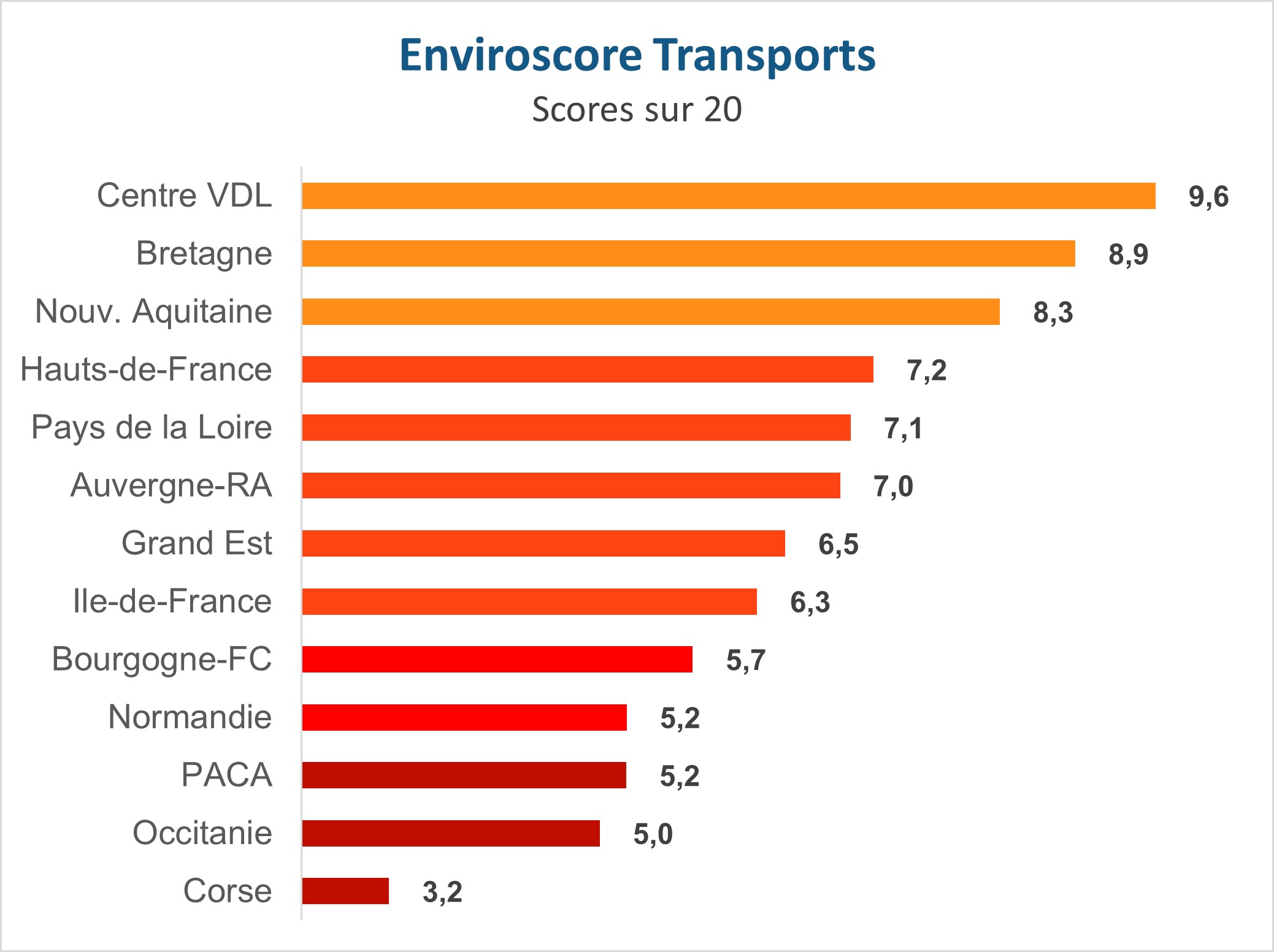 L’Enviroscore Transports intègre comme indicateurs la consommation énergétique fossile des transports, les approches liées à l’utilisation des véhicules individuels (places de covoiturage et bornes de recharge de véhicules électriques), l'utilisation des réseaux ferrés (fréquentation des gares et des trains TER - ou RER/tranciliens pour l'Ile de France -), les aménagements cyclables et la fréquentation des transports aériens.